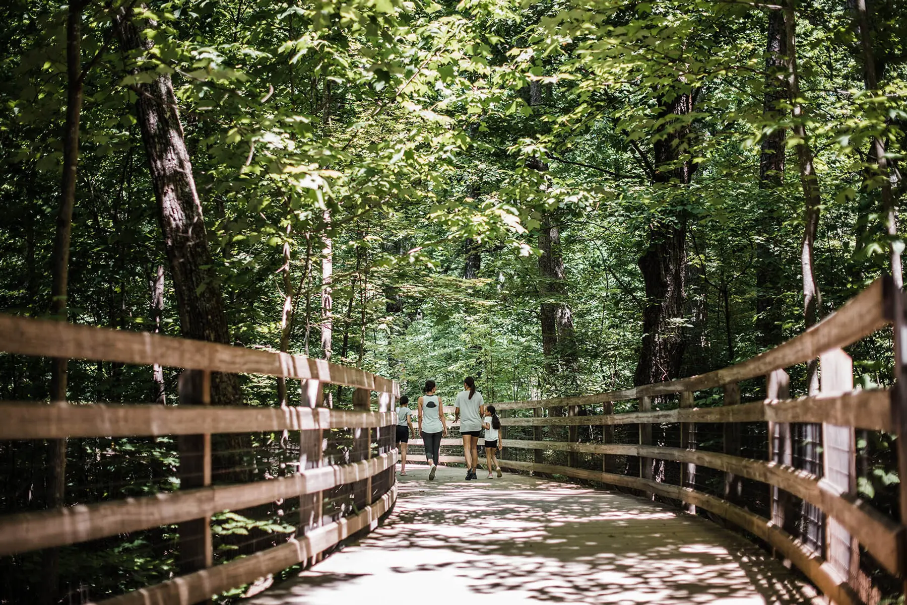 With native hardwood forest, deep ravines, and spectacular views of the Blue Ridge Mountains, the Saunders-Monticello Trail winds its way toward Monticello and back in a very manageable four miles. A maximum grade of 5% keeps it completely accessible to walkers, cyclists, and those in wheelchairs. The Saunders-Monticello Trail and park system are open to the public daily. Please observe all signage at the park.