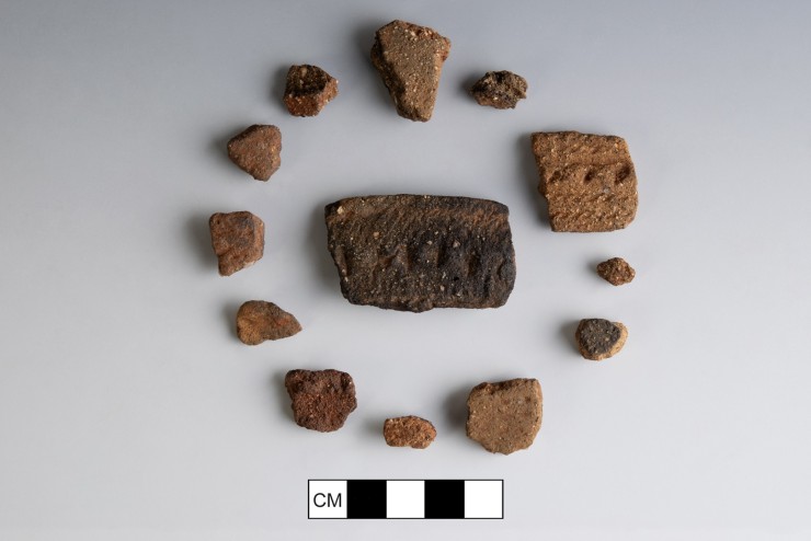 Prehistoric Indigenous coarse earthenware ceramics from Mountaintop Access (c. AD 900-1600). Surface treatments include added rim strips, cord marking, punctating, and notching.