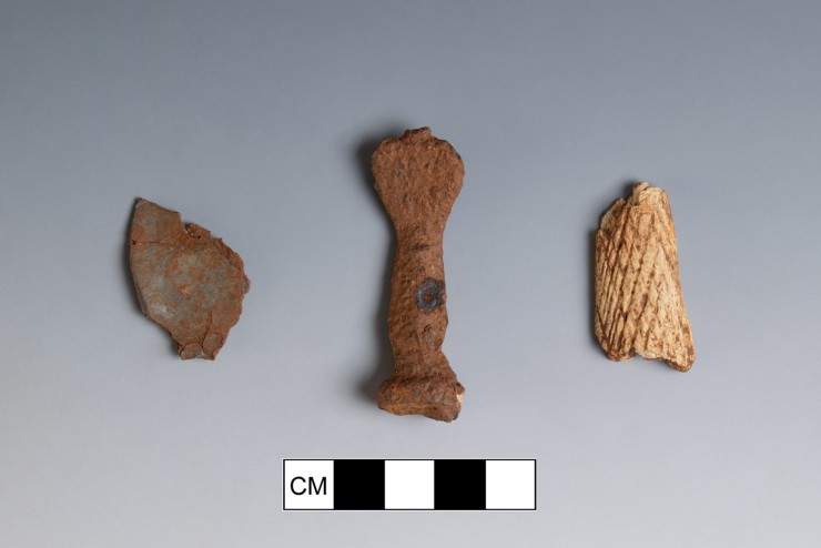 Utensils from Mountaintop Access. Left to right: Fragmented spoon bowl, iron handle, and carved bone handle
