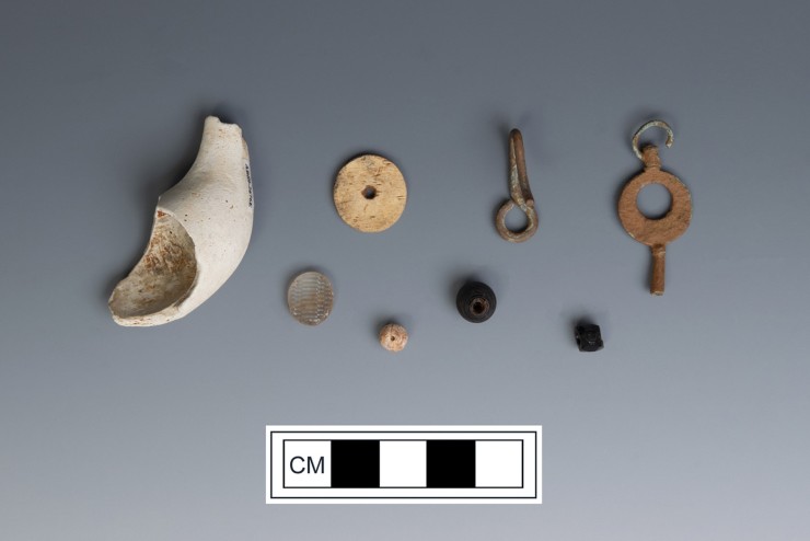 "Small finds" from Mountaintop Access. Left to right: tobacco pipe bowl, paste gem, button blank, 3 beads, clothing hook, and watch key
