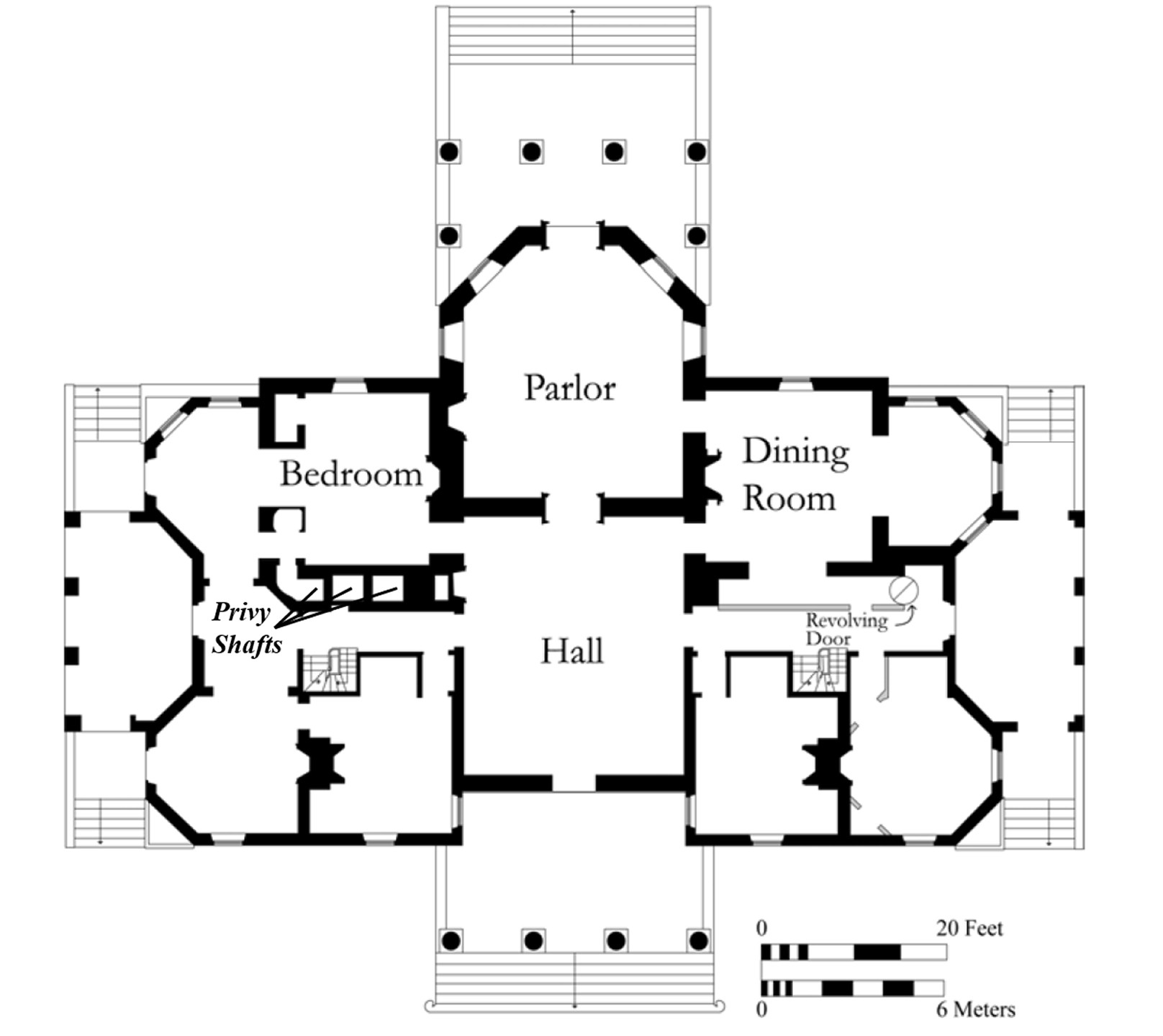 First, we consider evidence for Jefferson's design of the indoor privies and the tunnel. The privies were located in three adjacent, vertical brick shafts that were built during the rebuilding campaign of the 1790s. The first version of the mansion lacked indoor privies. The three shafts were located between the eastern wall of Jefferson's bedroom and the parallel western wall of the southern side passage (Mesick Cohen and Wait Architects 1991[1993]:58, 65). Two of the privies were located on the ground floor. One was accessed from Jefferson's bedroom and the second from southern side passage from the sitting room used by his daughter Martha. The third privy was located off the southern side passage on the second floor.