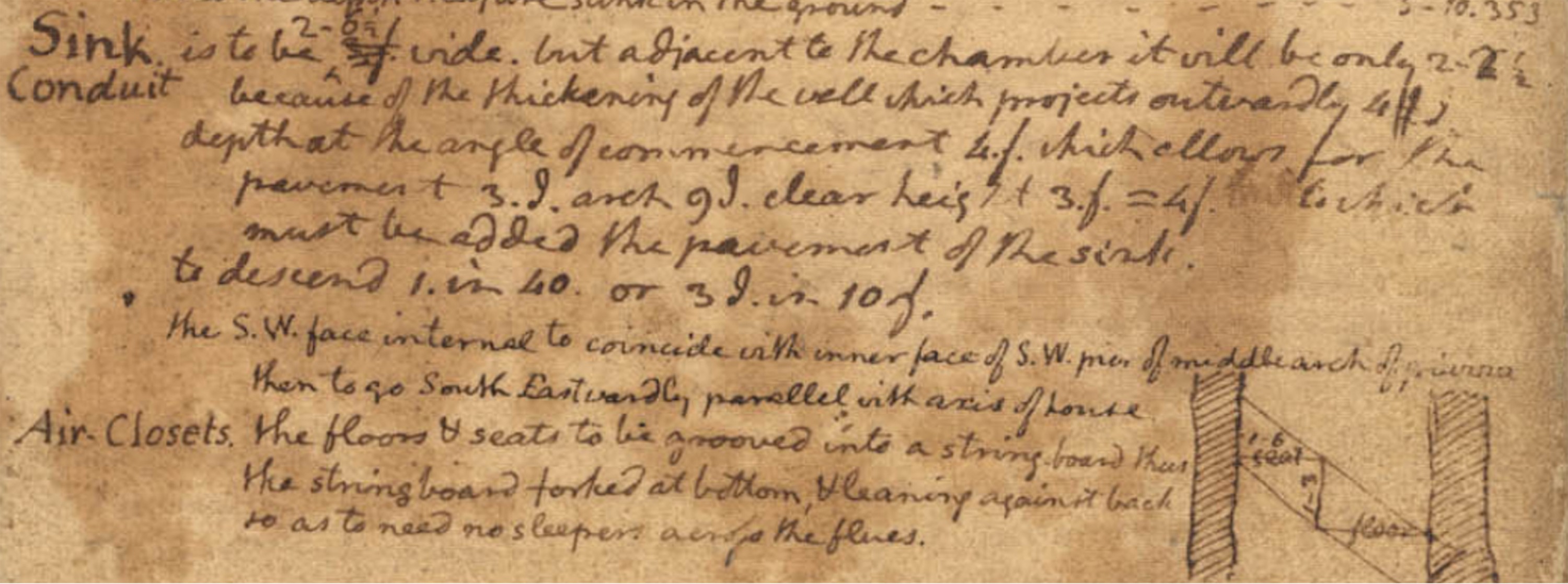 Further clues come from an 1802 letter, when the rebuilding campaign was well underway. Jefferson asked joiner James Oldham to prioritize finishing the carpentry in the second and third air closets. His reasoning was simple: "…because it will be very disagreeable working in them after even one of them begins to be in use" (Jefferson 1802). This makes sense if the waste from each adjacent shaft ended up in a single receptacle where it was allowed to accumulate.